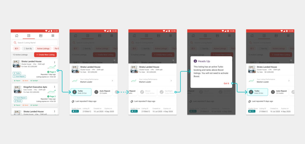 The new listing design tested overwhelmingly positive from both agents and consumers, validating its impact and usability. Next, I will go through the activation phase and user-flow for product purchase. Next, I began working on the product activation flows from within agent’s listing management screen.